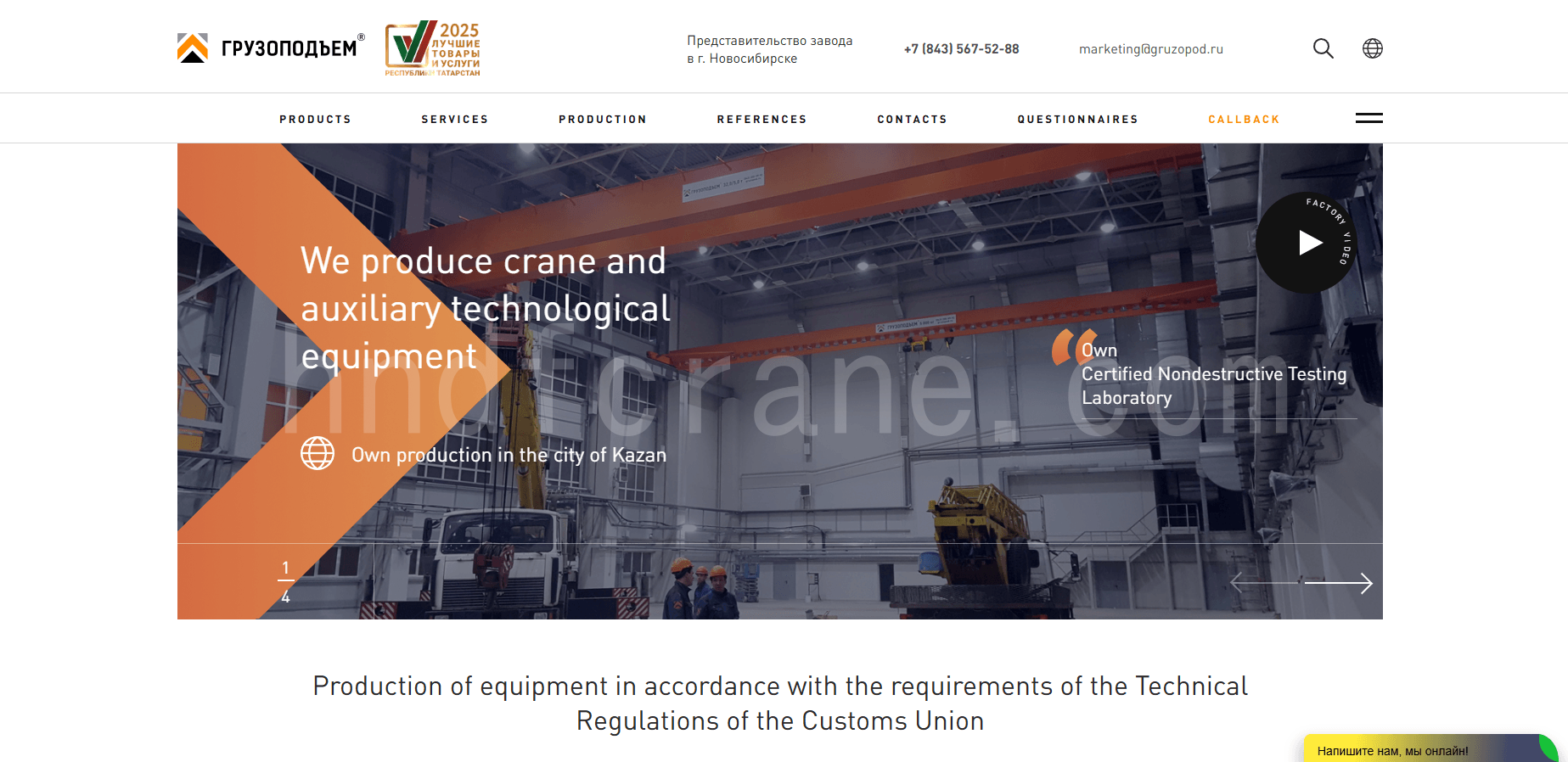 Gruzopodyem è un rinomato produttore russo di gru EOT e attrezzature tecnologiche ausiliarie, con oltre dieci anni di esperienza nel settore. La sede centrale e lo stabilimento produttivo dell'azienda si trovano a Kazan e l'azienda gestisce un laboratorio certificato per prove non distruttive, per garantire che tutte le attrezzature soddisfino elevati standard qualitativi e i regolamenti tecnici dell'Unione Doganale. La gamma di prodotti comprende gru e accessori, attrezzature tecnologiche ausiliarie, attrezzature per l'industria petrolifera e del gas, rotatori di saldatura, dispositivi antideflagranti e ricambi per gru, con versioni industriali generiche, ignifughe e antideflagranti.