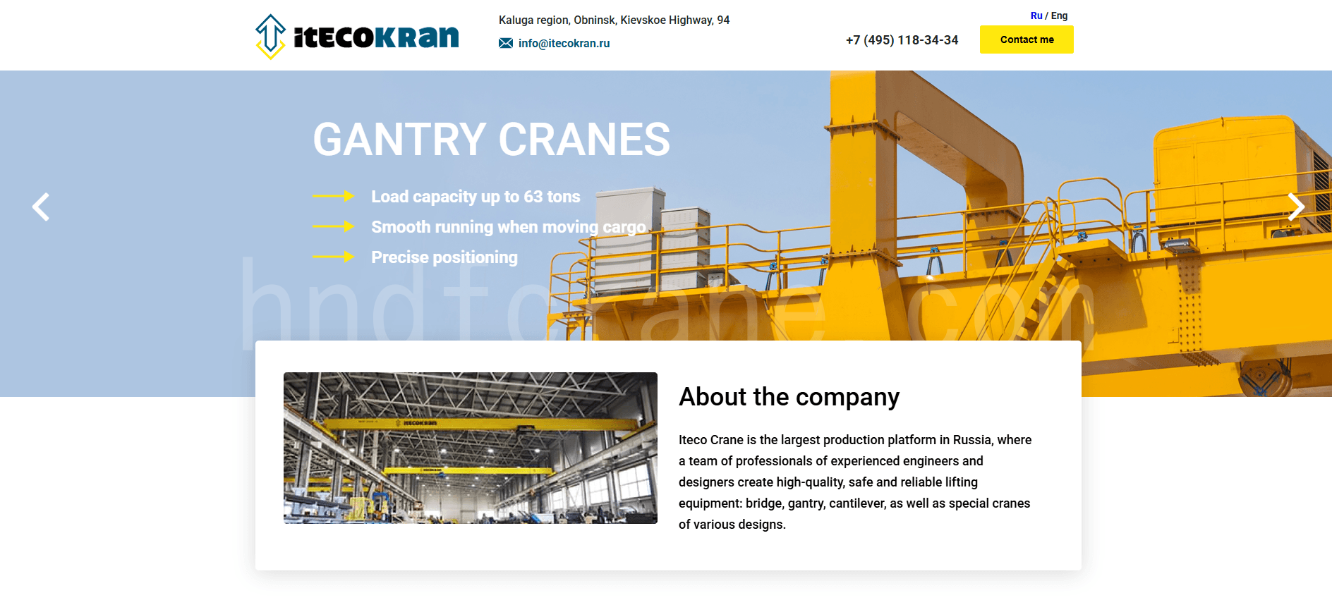 Iteco Crane è uno dei maggiori produttori russi di gru EOT, con sede a Obninsk, nella regione di Kaluga. L'azienda riunisce un team di ingegneri e progettisti professionisti per produrre attrezzature di sollevamento di alta qualità, sicure e affidabili, tra cui gru a ponte, gru a portale, gru a sbalzo e gru speciali di varie configurazioni.
