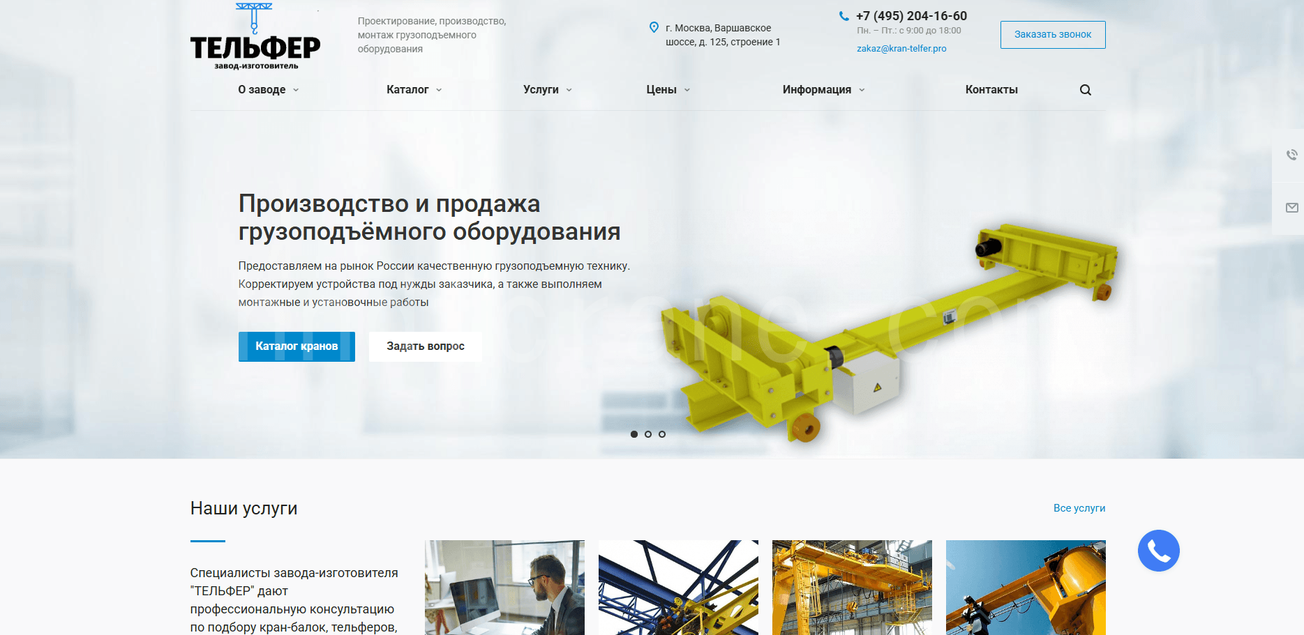 Certificata secondo il sistema di gestione della qualità ISO 9001-2011 e in possesso di tutte le licenze e i permessi necessari, tra cui SRO e NAKS, ТЕЛЬФЕР offre servizi a ciclo completo, dalla progettazione e produzione all'installazione, manutenzione e modernizzazione. Il suo team di specialisti qualificati offre consulenza professionale per aiutare i clienti a scegliere le soluzioni di gru più adatte e garantisce prezzi competitivi in base alle condizioni di mercato.