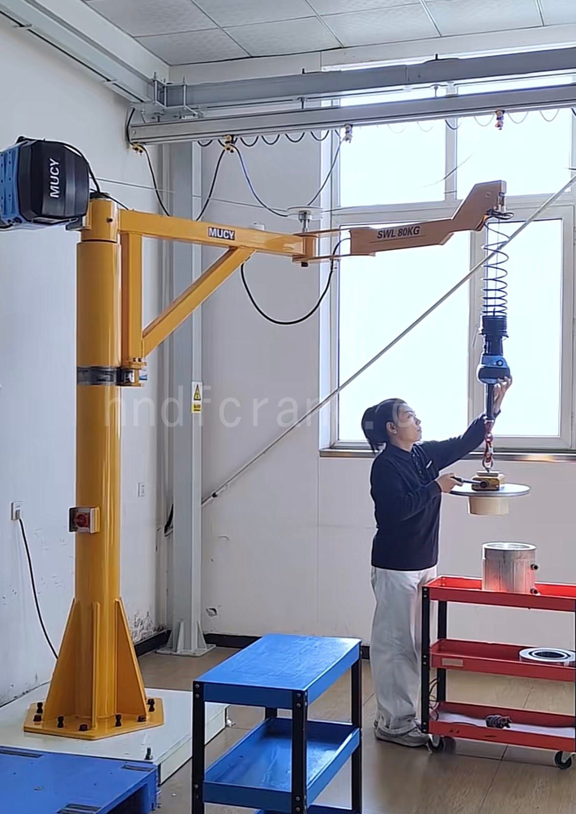 - Trolley hoist or chain hoist: The hoist is mounted on the outermost segment of the articulated arm and is used for lifting, lowering, and moving loads. The hoist can be manual, electric, or pneumatic, depending on the application and required lifting capacity.